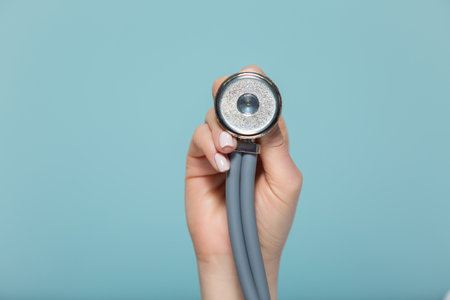 Hand of a female doctor with a stethoscope, on a blue background. Copy paste. healthcare concept.