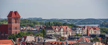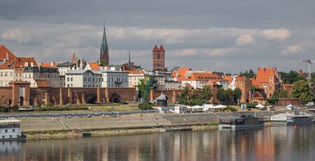 Torun, Poland - August 2020 : Panoramic view of the tenement houses, church tower and arched bridge over Vistula river Old town in Torun in summer,