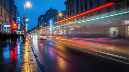 A bustling city street at night, illuminated by the glow of streetlights and the streaks of passing vehicle lights. The wet pavement reflects the colorful lights, creating a dynamic and lively atmosphere.