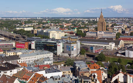 RIGA, Latvia - July 17, 2013: Cityscape of the capital city of Latvia, including the railroad station, the coach station and a big mall with a cinema.