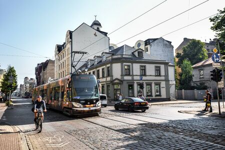 Riga, Latvia - August 23, 2017 : View on old colorful buildings and streets of Riga, modern tram, Latvia. Architecture in Riga city center.