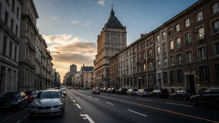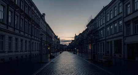 An empty cobblestone street stretches between rows of tall classic European buildings under a twilight sky. The quiet urban scene captures the serene atmosphere of a city at dawn or dusk with streetlights beginning to glow.