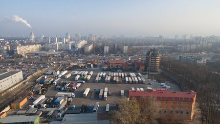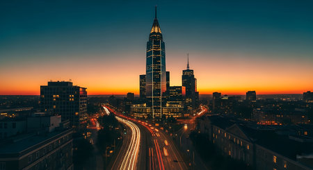 Lodz, Poland - July 08, 2022: Wide angle aerial view of cityscape with mix of modern and medieval architecture next to highway and city tram
