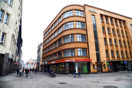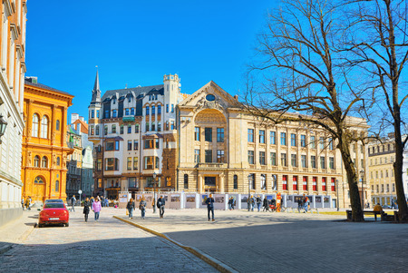 Riga, Latvia - April 12, 2018: Latvian Broadcasting Radio Company (Latvijas Radio) near Dome Square (Doma laukums).