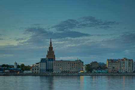 Night view on the illuminated riverside with reflection on the river in Riga, Latvia