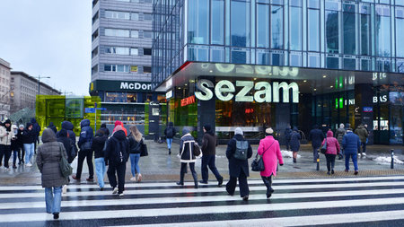 Warsaw, Poland. 12 January 2025. People of different ages crossing the road through. Winter street of a big city. View of a city street with residents, tourists and modern building