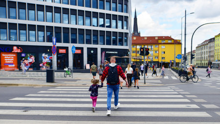 Szczecin, Poland. July 16, 2025. Downtown on a day and street of a big city. People of different ages crossing the road through. View of a city street with residents, tourists