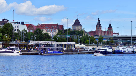 Szczecin, Poland. 16 July 2025. Landscape view and ships and boats on the Odra River