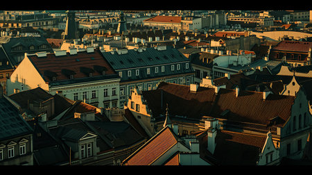 An aerial view presents a sprawling cityscape at sunset. Numerous buildings and structures are bathed in warm golden light. The composition features a variety of architectural styles under a partly cloudy sky. This image may be suitable for various editorial or commercial applications.