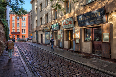 Krakow (Cracow), Poland - September 24, 2018: Kazimierz historic Jewish Quarter, traditional establishments at Szeroka street, tailor, carpenter, convenience store and haberdashery, city landmark.