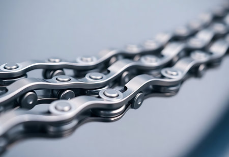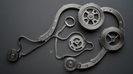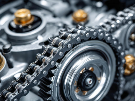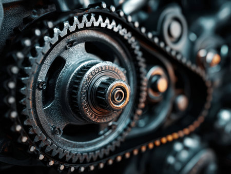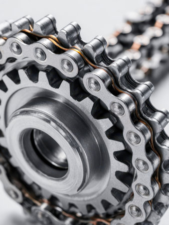 A detailed close-up image showcasing an industrial gear mechanism featuring metal chains and components, capturing the essence of modern manufacturing and engineering.