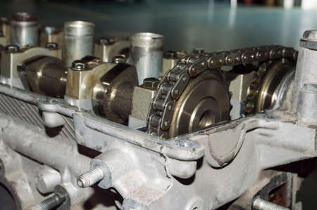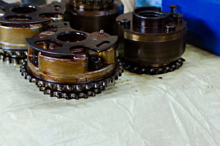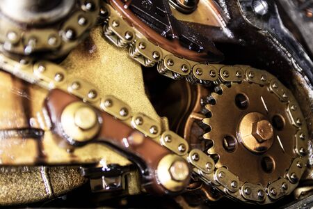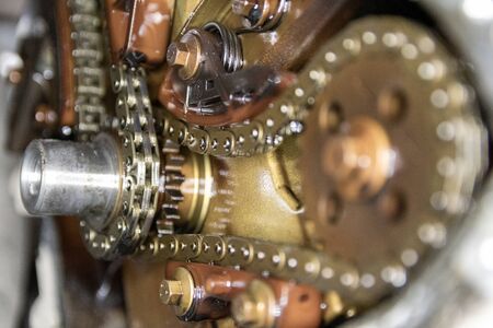 Close-up on a disassembled engine with a view of the gas distribution mechanism; chain; gears and tensioners during repair and restoration after a breakdown. Auto service industry.