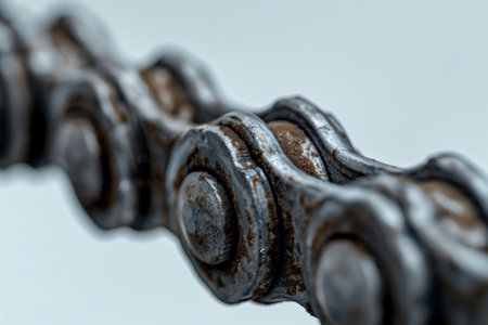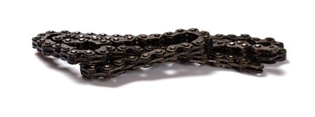 Close up of a dirty bike chain showing the need for maintenance with a white background