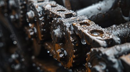 Wet metal chain rotating on industrial gears, glistening with water drops, captures the essence of strength and power in mechanics and engineering, highlighting the dynamic nature of machinery