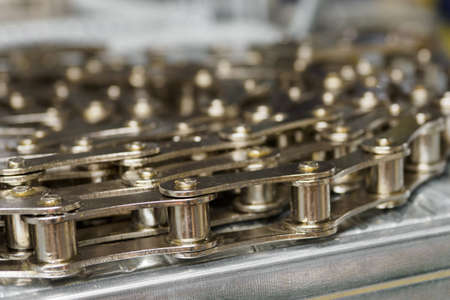 Roller chain with sprocket on dark background. It is used on cars, motorcycles, bicycles and in mechanical engineering. Can be used as a background