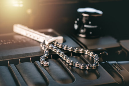 The drive chain of the camshafts of an automobile internal combustion engine under the removed valve cover