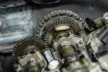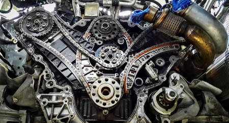 Close-up on a disassembled engine with a view of the gas distribution mechanism, chain, gears and tensioners during repair and restoration after a breakdown. Auto service industry.