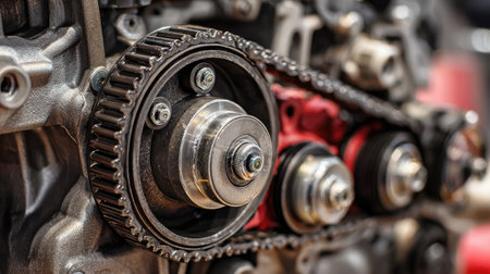 This high-resolution image showcases a detailed close-up of an engine timing belt system, featuring pulleys and gears in a mechanic workshop, emphasizing the workmanship and technology involved in automotive engineering.