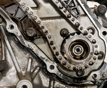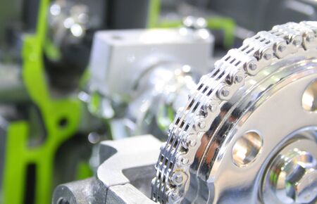 Close up chain camshaft timing of engine on blur camshaft backgrpound.