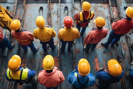 A team of dock workers, wearing hard hats and high-visibility vests, works together on a cargo ship, using hand signals to guide a large crane. In the background, shipping containers are stacked and another cargo vessel is visible, depicting a busy day at an industrial port. The image showcases teamwork, logistics, global trade, and manual labor.
