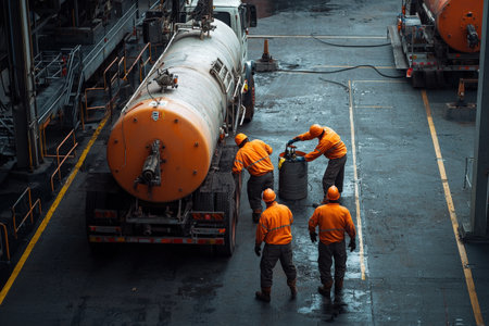 Diverse team of dock workers wearing hard hats and safety jackets, working at a shipping port