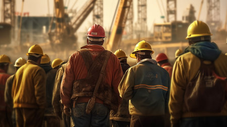 Group of construction workers in yellow helmets collaborating on a rugged site with heavy machinery, emphasizing teamwork and determination in a challenging outdoor setting