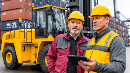 Two dockworkers are planning logistics outdoors with a digital tablet at the industrial port