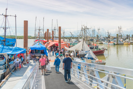 Steveston, British Columbia/Canada - June 24, 2018: people shopping for freshly caught seafood from boats docked at Fisherman's Wharf, a popular attraction.
