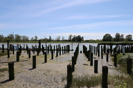 Abandoned docking pillars and dock for small boats covered with moss and decay. Regional nature reserve of Isonzo river, Italy.