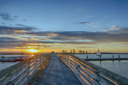 Wooden boardwalk or pier for walking along the shoreline of Sidney, British Columbia, Canada