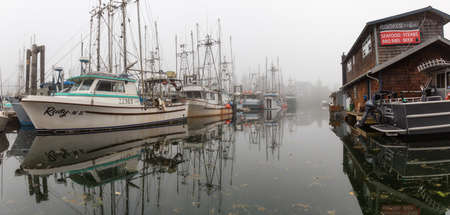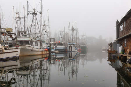 SEATTLE, WA - OCTOBER 28, 2017: Fishing Boats reflected on the Puget Sound waters and Docked at Fishermen's Terminal in Seattle on a foggy morning.