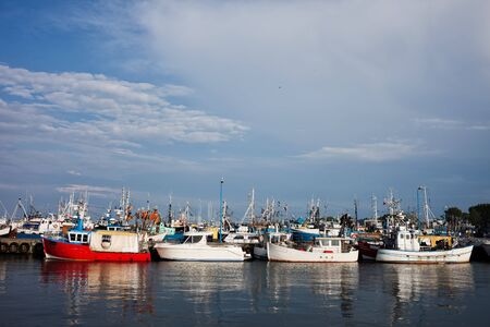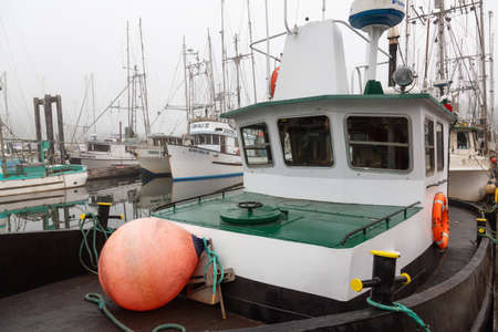 Fishing Boats in a Harbor and a Gray Sky. Fishermen Boats moored at Port in Richmond BC, Canada-Nobody, selective focus, travel photo.