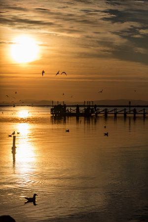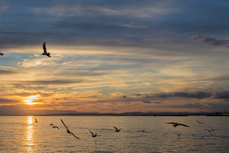Beautiful sunset sky scenery of Kushiro in Hokkaido, Japan where seagulls fly