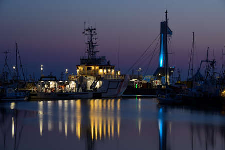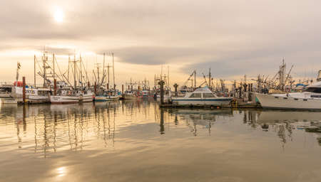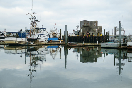 Westport, WA, USA July 22, 2016: Commercial fishing boats of all sizes are reflected in the calm waters of Westport Marina