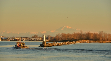 Mount Baker in dusk. View from White Rock pier, British Columbia, Canada.