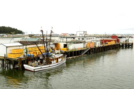 Commercial fishing boats sitting at dock getting unloaded at the fish processing plant in Charleston Oregon on the Pacific Ocean near Coos Bay