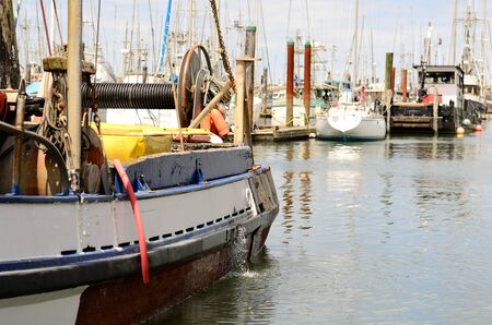 Sunset landscape of Dutch harbor Lauwersoog with fishing ships long the Waddensea in Groningen the Netherlands