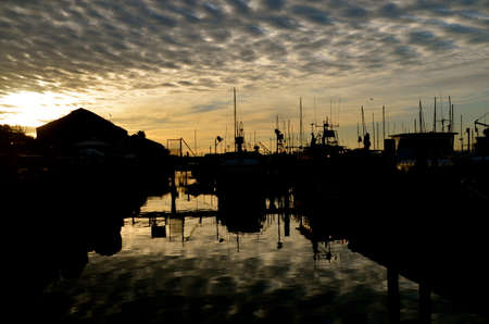 Beautiful sunset with clouds over marina with boats in Bandon, Oregon