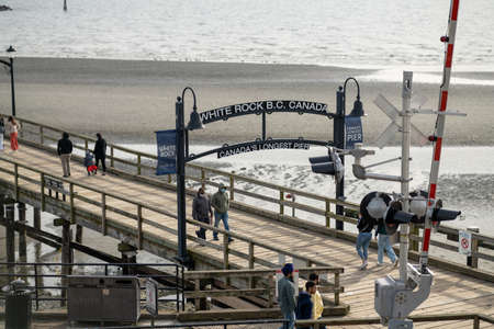 White Rock, BC, Canada-March 31 2021: People stroll along the famous 1,500 ft. long pier in the dusk.