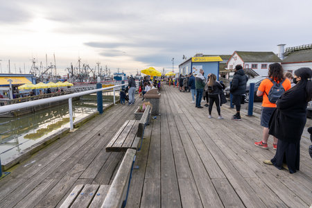 Richmond, BC, Canada - MAR 13 2021 : Steveston Harbour Fisherman's Wharf. People wearing face mask during covid-19 pandemic period.