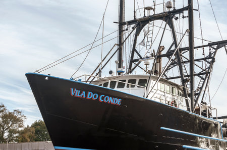 Fairhaven, Massachusetts, USA - October 20, 2019: Commercial fishing vessel Vila do Conde, hailing port Cape May, New Jersey, hauled out at Fairhaven Shipyard