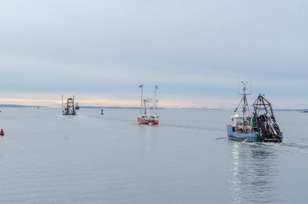 New Bedford, Massachusetts, USA - December 4, 2019: String of commercial fishing boats crossing New Bedford outer harbor to go fishing