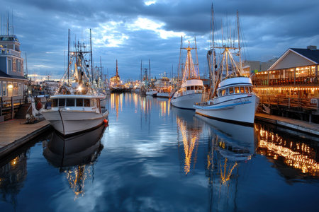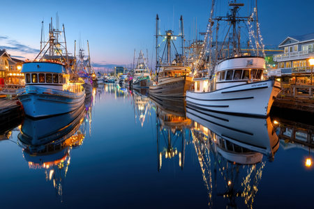 Fishing boats moored at a dock with festive lights reflected in the water at dusk