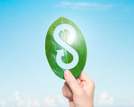 Hand holding a leaf with infinity arrow on blue sky background.