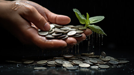 A hand is holding a handful of coins, showcasing a small green plant that is growing out of it. The coins are cascading through the fingers and creating a beautiful contrast against a black surface.