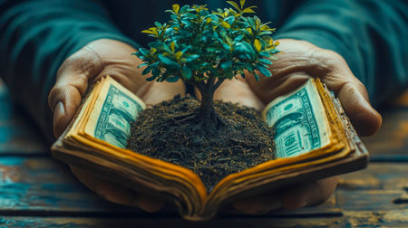 Hands holding a small tree growing from money, symbolizing financial growth, sustainability, and environmental investment. The concept focuses on eco-friendly finance and green business.