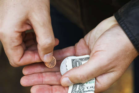 Close up of person wearing disposable gloves giving a coin to a hand beggar.