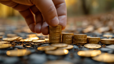 A person is stacking coins on a pile of gold, AI