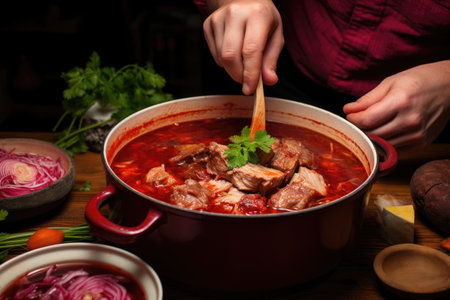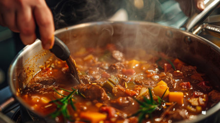 A rustic scene of a hand stirring a savory meat and vegetable stew in a pot. The rich aromas and vibrant ingredients create a warm, inviting atmosphere.