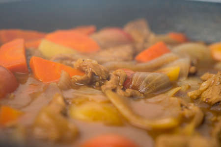 A cozy kitchen scene with a pot of aromatic curry simmering on the stove, tantalizing the senses